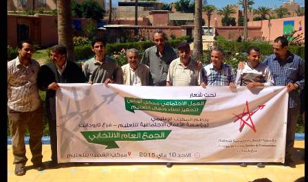نظم المكتب الإقليمي لمؤسسة الأعمال الاجتماعية للتعليم فرع تارودانت يوم الأحد 10 ماي 2015 بمركب القصبة ،الجمع العام الانتخابي تحت شعار : " العمل الاجتماعي مدخل أساس لتحفيز نساء و رجال التعليم " . افتتح اللقاء بآيات بينات من الذكر الحكيم . بعد ذلك تفضل النائب الاقليمي ذ ابراهيم اضرضار رئيس المجلس الاقليمي للمؤسسة بكلمة رحب من خلالها بعضو المكتب الوطني ومناديب الجمع العام ، منوها بالمجهودات التي بذلها المكتب الاقليمي طيلة تحمله المسؤولية .و خلال مداخلته دعا الى خلق فضاءات للتقاسم و تطوير أهداف الأعمال الاجتماعية . و في ذات السياق أشاد ذ محمد أزيرار عضو المكتب الوطني بالدعم المتواصل للنائب الاقليمي والمقاربة التشاركية التي يعتمدها المكتب الاقليمي لتارودانت لمختلف أنشطته .و أضاف أن هذا الورش الثقافي والاجتماعي الذي نتواجد فيه ما هو الا دليل قاطع على العمل الدؤوب لمكونات أعضاء المكتب .و خلال كلمته قدم للحضور الكريم تحيات الكاتب العام الوطني ذ عبد الحق المامون و أعضاء المكتب الوطني .و علاقة بالموضوع استحضر في تدخله مهام المندوب كما جاء به منطوق القانون الأساسي للمؤسسة .
