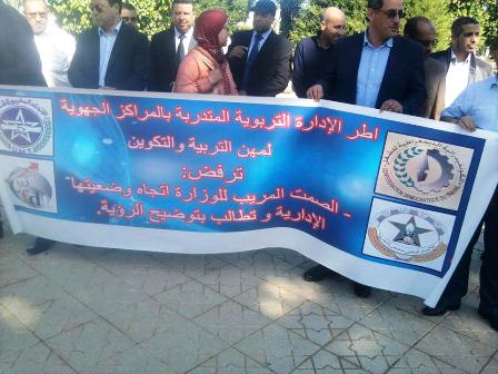 للمرة الثانية وبعد خوضها لوقفة احتجاجية بالمراكز الجهوية الأربع ، خاضت أطر الإدارة التربوية المتدربة بمسلك تكوين أطر الإدارة التربوية بالمراكز الجهوية لمهن التربية والتكوين وقفة احتجاجية إنذارية ثانية بمديرية الموارد البشرية بوزارة التربية الوطنية والتكوين المهني بالرباط مطالبين الوزارة بإخراج القوانين المنظمة للمسلك إلى حيز الوجود وتوضيح آفاقه المستقبلية قبل إجراء امتحانات التخرج ،منددين في بيان سابق وقعت عليه أربع مركزيات نقابية بالصمت المطبق الذي تنهجه الوزارة في التعامل مع ملفهم المطلبي متهمة الوزارة بـ"التلكؤ وعدم التعامل بجدية ، وغياب رؤية واضحة لآفاق هذا المسلك خاصة أن السنة التكوينية أوشكت على الانتهاء ، وفي تصريح استقاه الموقع في اتصال هاتفي بأحد الأطر الإدارية التربوية المتدربة من عين المكان جاء فيه: اولا: نحن نخضع لتكوين اداري جميع مصوغاته بعيدة عن الحراسة العامة ثم ان الحراسة العامة يمكن للاستاذ المشاركة فيها من خلال الاسناد ثم اذا افترضنا هذا المعطى وخضعنا لسنة تكوينية وسنة في الانتظار ثم شاركنا في اسناد الحراسة العامة ، الا تتفطن الوزارة الى اننا ضيعنا سنتين + سنتين جزافيتين في تغيير الاطار . هنا أي موظف اعطي له الاختيار سيختار الاسناد ربحا للسنوات بدل التكوين وانتظار سنة هنا تشبتنا بمنصب مدير مؤسسات التعليم بمختلف الاسلاك . هناك اعتبار اخر لوافترضنا الاسناد فشاركنا هنا على سبيل المثال : اخترنا نحن الثلاثة منصبا واحدا واسند لواحد فقط فهل سينتظر الاخريان سنة اخرى هنا سنقع في ثلاث اشكالات : 1 ما معايير التعيين؟ 2 ـ مامعايير الاسناد ؟ 3ـ اي مهمة سنعوض عنها في هذه الحالة ؟ الحل هنا القطع مع التدرج في المهام وتوسيع مجالات التكوين .