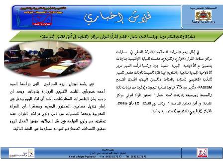 في إطار دعم القدرات النسائية للانخراط الفعلي في  مسارات مراكز صناعة القرار الاداري والتربوي، نظمت النيابة الإقليمية بتاونات بتنسيق مع الأكاديمية  الجهوية  للجهة  يوما دراسيا ترأسه السيد مدير الاكاديمية الجهوية للتربية والتكوين لجهة تازة الحسيمة تاونات بحضور السيد النائب الاقليمي للوزارة بتاونات والمنسق الجهوي الكندي لمشروع PAGESM، وأزيد من 75 قيادية نسائية تربوية وإدارية من نيابات تازة والحسيمة وجرسيف وتاونات تحت  شعار " تحفيز المرأة لتولي مراكز  القيادة  في أفق تحقيق المناصفة "  وذلك يوم الثلاثاء  12 ماي 2015، بالمركز الإقليمي للتكوين المستمر بتاونات .....