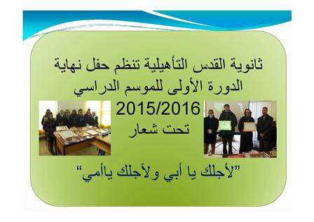 عـــــاشت ثانوية القدس التأهيلية بتويسيت صبيحة يوم الثلاثاء 16 فبراير 2016 نشاطا تربويا هاما، تمثل في تكريم تلميذات وتلاميذ المؤسسة المتفوقون خلال الدورة الأولى من الموسم الدراسي الحـــالي، وقد حضر الحفل السيد باشا مدينة تويسيت بمعية السيد رئيس المجلس البلدي لجماعة تويسيت والسيد رئيس المجلس القروي لبلدية سيدي بوبكر والسيد ممثل جماعة راس عصفور و ممثل جمعية أمهـات وآباء وأولياء التلاميذ والسادة رؤساء المؤسسات التعليمية وممثلو مسلك تكوين اطر الادارة التربوية ورؤساء جمعيات المجتمع المدني وأطر المؤسسة التربوية والإدارية ومجموعة من التلاميذ المتفوقون و آباءهم.