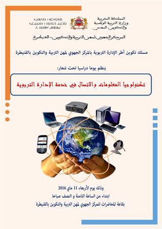وبغاية تشجيع وتطوير و توظيف تكنولوجيا المعلومات والاتصال الخدمات ينظم مسلك أطر الإدارة التربوية بالمركز الجهوي لمهن التربية و التكوين بالقنيطرة يوما دراسيا تحت شعار :تكنولوجيا المعلومات و الاتصال في خدمة الإدارة التربوية ، وذلك يوم الأربعاء 11 ماي 2016 بالمركز الجهوي لمهن التربية و التكوين بالقنيطرة، ويأتي هذا اليوم الدراسي لتعزيز و تنمية قدرات الأطر الإدارية و تبادل الخبرات في هذا في أفق رقمنة الإدارة التربوية لتسهيل التدبير الإداري و الاتصال و التواصل ،خاصة أن هذا القاء سيعرف مشاركة وازنة لعديد من الفعاليات في المجال وأيضا خريجي المركز و الأطر الإدارية المتدربة ،وقد خصص المركز الجهوي لمهن التربية كل الوسائل اللوجستية لإنجاح هذا اليوم الدراسي .