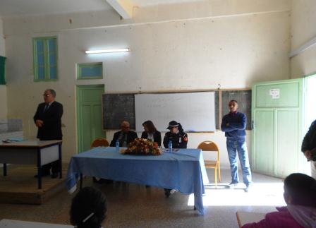 في اطار الشراكة القائمة بين وزارة التربية الوطنية والتكوين المهني والمصالح الأمنية ، وتفعيلا للاستراتيجية الأمنية في التصدي لكل المظاهر المشينة والشوائب التي اضحى محيط المؤسسات التعليمية مسرحا لها ، وسعيا وراء توفير الأجواء الآمنة لسير العملية التربوية ، احتضنت الثانوية الإعدادية سيدي بومدين بصفرو يومه : الأربعاء 15 مارس 2017 ، لقاء تحسيسيا وتواصليا أطره مسؤولو الإدارة الإقليمية للأمن الوطني بصفرو في موضوع " العنف والهدر المدرسيين أية علاقة " وألقيت عدة عروض تناولت أربعة قضايا أساسية : 1) ـ العنف بالوسط المدرسي . 2) التعاطي للمخدرات . 3) الانعكاسات السلبية لسوء استعمال الأنترنيت على الحياة الشخصية للفرد والمجتمع . 4) السلامة الطرقية .
