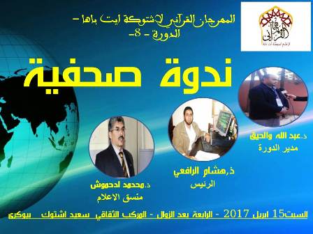 تنهي الجمعية المغربية  لأساتذة  التربية الاسلامية  فرع اشتوكة ايت باها وشركاؤها  لكافة  السادة الاعلاميين  والصحفيين  وكافة المؤسسات الاعلامية  المحلية والجهوية والوطنية  ولعموم المهتمين  انها ستنظم ندوة صحفية  من  اجل تقديم  مستجدات الدورة الثامنة للمهرجان القرآني لاشتوكة ايت باها  وذلك يوم السبت 15 ابريل 2017 ابتداء من الساعة الرابعة بعد الزوال  بالمركب الثقافي سعيد اشتوك  بيوكرى