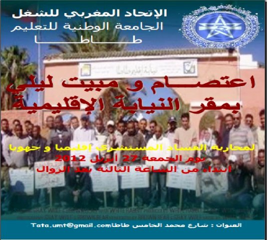 الجامعة الوطنية للتعليم(ا م ش) بطاطا تقرر خوض اعتصام بمقر النيابة الإقليمية يوم الجمعة 27 أبريل 2012 ابتداء من الساعة الثالثة بعد الزوال مع مبيت ليلي في نفس اليوم