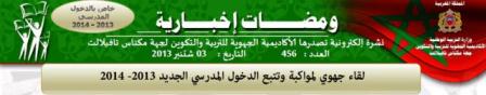 "في سياق تتبع ومواكبة مختلف العمليات والترتيبات الجارية لإحكام الدخول الدراسي لهذا الموسم بجهة مكناس تافيلالت، وفي إطار تنزيل مقتضيات دليل تحضير ومواكبة الدخول الدراسي الجديد 2013- 2014، خصوصا ما يتعلق منه بمجال التعبئة والتواصل، تخصص نشرة "ومضات إخبارية " تغطية إخبارية هامة، بحيث سنعمل على تخصيص حيز هام وأعداد متتالية لعرض سلسلة من الأنشطة والتقارير والمعطيات والأرقام ذات الصلة بالموضوع. أملنا أن ترقى هذه الخدمة إلى مستوى وقيمة الحدث، وأن تتمكن من ملامسة مختلف جوانب هذا الاستحقاق التربوي الهام....."