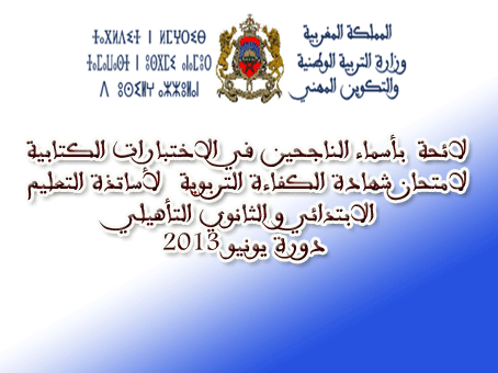لائحة بأسماء الناجحين في الاختبارات الكتابية لامتحان شهادة الكفاءة التربوية لأساتذة التعليم الابتدائي و الثانوي التأهيلي دورة يونيو 2013