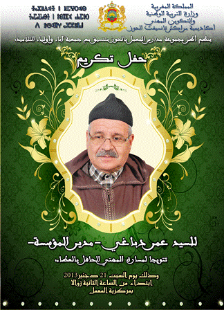 سيرا على منهج الوفاء والتقدير الذي تنهجه الأسرة التعليمية في تكريم العاملين بالقطاع تقديرا لمجهوداتهم ولمكانتهم الاعتبارية وللتضحيات الجسيمة التي قدموها، نظم أطر مجموعة مدارس المعمل بإقليم الحوز حفل تكريم للسيد "عمر دباغي" مدير المؤسسة تتويجا لمساره المهني الحافل بالعطاء، وذلك يوم السبت 21 دجنبر2013 ، بمركزية م/م المعمل ابتداء من الساعة الثانية بعد الزوال، وحضر الحفل إلى جانب العاملين بالمؤسسة : ممثلو نيابة الحوز والمفتشون والمديرون والشركاء الاجتماعيون وممثلو المجلس البلدي وعائلة السيد المدير وأصدقاؤه و المساعدون التقنيون و جمعية آباء وأولياء التلاميذ و ممثلو تلاميذ المؤسسة ...