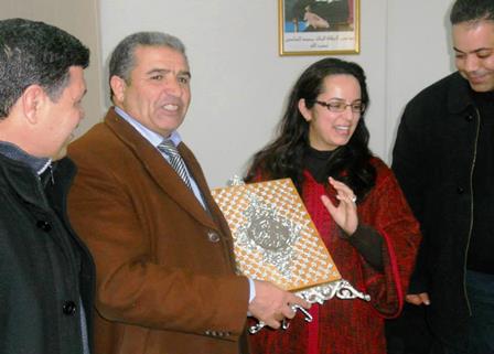 الصورة مأخوذة من صفحة نيابة الحاجب على الفايسبوك ( نائبة وزارة التربية الوطنية والتكوين المهني بالحاجب تسلم هدية للمفتش المحال على التقاعد في حفل آخر نظم بنيابة الحاجب)