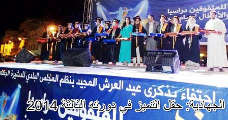 تخليدا لعيد العرش المجيد، وعملا على تحفيز الاجتهاد والتميز، وفي إطار الأيام الرمضانية، نظمت الجماعة الحضرية للدشيرة الجهادية ليلة السبت 21 يوليوز 2014 الموافق ل 19 رمضان 1435 هـ حفلا كبيرا بساحة الحفلات بالدشيرة على شرف التلاميذ المتفوقين والمتميزين دراسيا والأبطال الرياضيين المتألقين في مختلف المجالات الرياضية. حضر الحفل السادة: البرلمانيون ورئيس المجلس البلدي للدشيرة ورئيس المجلس الإقليمي لعمالة انزكان ايت ملول ورؤساء المصالح الخارجية ونواب ومستشارو رئيس المجلس البلدي، وفعاليات من المجتمع المدني وممثلو وسائل الإعلام وجمهور غفير من الأمهات والآباء والتلاميذ وساكنة المنطقة، التأم الجميع من أجل تكريم المتميزين الذين حققوا أعلى النتائج في مختلف المستويات والمسالك والشعب الدراسية. وقد عرف الحفل حضورا متميزا للأبطال الرياضيين الذين حققوا إنجازات وطنية و دولية في مختلف الأنواع الرياضية والمنتمين لمختلف الجمعيات الرياضية المحلية. وفي كلمة بالمناسبة أكد السيد رمضان بوعشرة رئيس المجلس البلدي على أهمية الاحتفال وأبعاده التربوية والاجتماعية ودلالاته العميقة والسياقات المحيطة به مؤكدا على التوجه نحو تعزيز ثقافة التحفيز والتميز والتشجيع، وهنأ جميع التلاميـــذ و الأبطال المكرمين و نوه بقطاع التربية و التكوين والرياضة باعتبارهما قاعدة للتربية على المواطنة والتشبث بالهوية الحضارية للأمة، كما شكر الطاقم المنظم على الإعداد الجيد لهذا الحفل البهيج وكل المساهمين والداعمين والمساندين الذين ساهموا في إنجاحه ماديا ومعنويا، وقد تخللت الحفل فقرات تنشيطية للفنان عموري مبارك الذي تجاوب معه الجمهور الحاضر، ووزعت جوائز قيمة على المتفوقين والمتفوقات في ليلة التميز الثالثة والتي كانت في مستوى تطلعات الحاضرين الذين ثمنوا هذه المبادرة المتميزة والسنة الحميدة ضمن برامج الأنشطة الثقافية الكبرى للمجلس البلدي للدشيرة الجهادية.