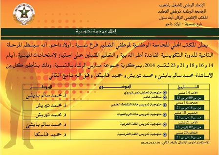 يعلن المكتب المحلي للجامعة الوطنية لموطفي التعليم فرع تمسية - أولاد داحو، أنه سينظم المرحلة الثانية للدورة التكوينية لفائدة أطر التربية و التعليم المقبلين على اجتياز الامتحانات المهنية، أيام 14 و 16 و 18 و 21 و 23 شتنبر 2014، بمركزية مجموعة مدارس الرشاد بالتمسية، وذلك بتأطير كل من الأساتذة: محمد سالم بايشى و محمد تيريش و حميد فاسكا، وفق البرنامج التالي: