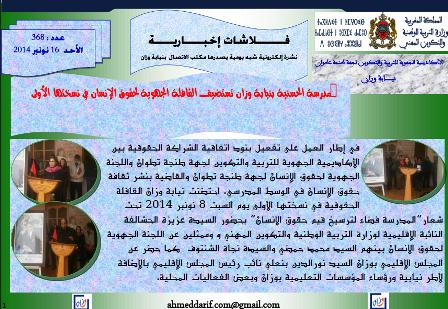 في ما يلي فلاش إخباري لنيابة وزان تحت عدد 368 في موضوع القافلة الجهوية لحقوق الانسان في نسختها الأولى تحل بنيابة وزان‎