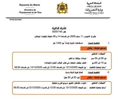 أصدرت وزارة التجهيز والماء، يوم الخميس 11 دجنبر 2025 على الساعة 14:56، النشرة الإنذارية رقم 142/2025، محذرة من اضطرابات جوية مرتقبة تشمل تساقطات ثلجية كثيفة وأمطار قوية أحيانًا رعدية، وذلك ابتداءً من يوم الجمعة 12 دجنبر إلى غاية الأحد 14 دجنبر 2025....