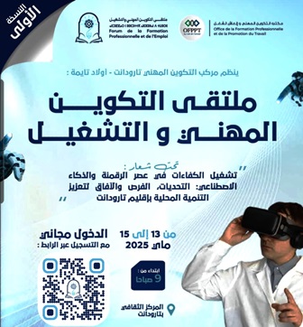تستضيف مدينة تارودانت خلال الفترة الممتدة من 13 إلى 15 ماي 2025 ملتقى التكوين المهني والتشغيل، تحت شعار:" تشغيل الكفاءات في عصر الرقمنة والذكاء الاصطناعي: التحديات، الفرص والآفاق لتعزيز التنمية المحلية بإقليم تارودانت ".~ هذا الملتقى يروم يروح خلق فضاء للحوار والتفكير بين مخت...