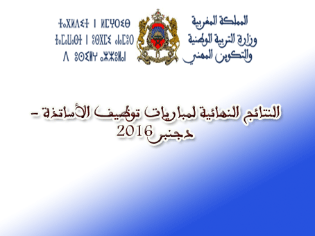 تنهي وزارة التربية الوطنية والتكوين المهني إلى علم الأساتذة الحاصلين على شهادة التأهيل المهني والرأي العام التعليمي والوطني أنه قد تم الإعلان اليوم الخمبس 19 يناير 2017 عن النتائـج النهائيـة لمباريات التوظيف - دورة دجنبر 2016، حسب الفئات التالية:
