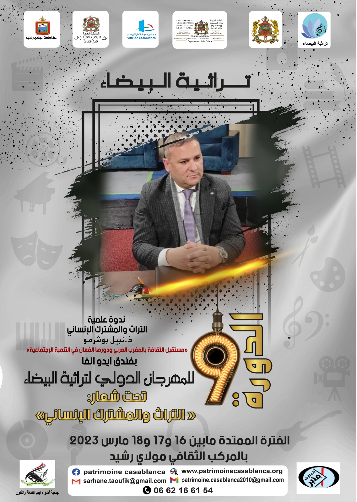 في إطار الدورة التاسعة للمهرجان الدولي لتراثية البيضاء والذي ينظم تحت شعار « التراث والمشترك الإنساني» في  الفترة الممتدة ما بين 16 و17 و18 مارس 2023 بالمركب الثقافي مولاي رشيد مقاطعة مولاي رشيد، يشارك الدكتور نبيل بوشرمو، أستاذ باحث في القانون العام بكلية العلوم القانونية والاقتصادية والاججتماعية باكادير،  في الندوة العلمية  المنظمة  بهذه المناسبة  في موضوع «مستقبل الثقافة بالمغرب العربي ودورها الفعال في التنمية الاجتماعية»  .