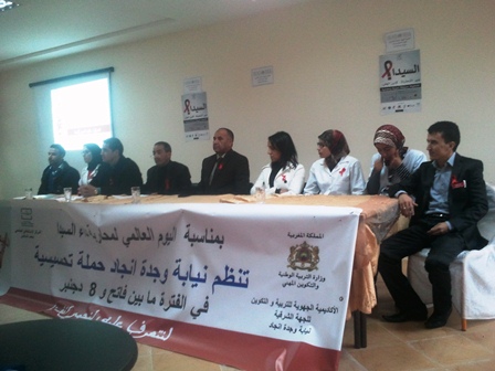 افتتح يوم 01 دجنبر 2014 بثانوية بن الهيم التأهيلية ، الاسبوع التحسيسي حول داء فقدان المناعة المكتسبة و الذي ينظم الى غاية 08 دجنبر حيث يشمل الثانويات التأهيلية : ابن الهيثم ، عابد الجابري ، عبدالله كنون ، السلام ، واد الذهب ، الشريف الادريسي ، تحت شعار " السيدا امر يهمنا جميعا ، لنتعرف عليه ، لنحمي انفسنا " وذلك بشراكة مع المركز الاستشفائي الجامعي محمد السادس . حضر الافتتاح مجموعة من الطبيبات الداخليات و الاطباء الداخليون بالمركز الاستشفائي الجامعي محمد السادس ووسائل الاعلام المحلية و الوطنية ، وتلاميذ واساتذة المؤسسة و بعض جمعيات المجتمع المدني . و في كلمته خلال حفل الافتتاح عبر السيد التهامي موسي النائب الاقليمي لوزارة التربية الوطنية والتكوين المهني لنيابة وجدة انكاد عن شكره العميق للسيدات الطبيبات و السادة الاطباء على حضورهم من اجل تنشيط هذه الايام التوعوية التحسيسية بمختلف المؤسسات الثانوية ، و كذا السيدات الأستاذات و السادة الاساتذة والادارة التربوية و بعض موظفو النيابة على المجهودات التي قاموا بها لإنجاح هذا اللقاء . و اوضح السيد النائب الاقليمي ان هذا النشاط يدخل في اطار انفتاح المؤسسة على محيطها الخارجي حيث انها لم تعد تقتصر على تلقين المواد الدراسية و التكوين فقط بل اصبحت ايضا مجالا للتوعية و التحسيس و التثقيف بالنظير