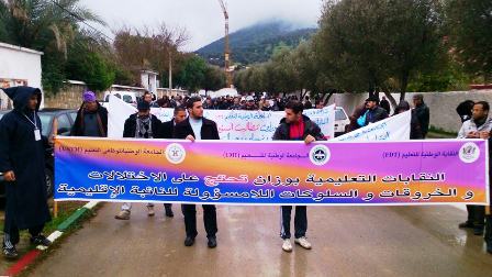 نظمت النقابات التعليمية بوزان :الجامعة الوطنية لموظفي التعليم (untm) والجامعة الوطنية للتعليم (umt) والنقابة الوطنية للتعليم (fdt) مسيرة احتجاجية حاشدة من مقر نيابة التعليم إلى مقر العمالة وذلك صبيحة يوم الأحد 18 يناير 2015 وصل فيها عدد المشاركين ما يفوق 300 مشارك من كافة أسلاك وهيئات المنظومة .ورغم تزامن المسيرة مع تهاطل الأمطار وانخفاض درجات الحرارة إلا أن مناضلي ومناضلات النقابات المذكورة أبوا إلا أن يشاركوا لاقتناعهم بأن هذا هو الاسلوب الامثل للرد على الخروقات والاختلالات والسلوكات اللاتربوية واللامسؤولة للسيدة النائبة منذ تعيينها في مارس 2013.وقد طالب المحتجون برحيل السيدة النائبة وتم تحميل المسؤولية المباشرة في بقائها الى الكاتب العام للوزارة الذي تستقوي به رغم توالي اللجان. وقد رفعوا خلال المسيرة عدة شعارات مثل :"وخا الشتا وخا لعجاج الأستاذ غايحتج" و"علاش جينا واحتجينا النائبة تمشي علينا" .