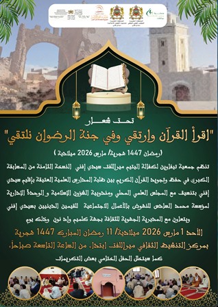 في أجواء روحانية يزدان بها شهر رمضان المبارك، تستعد جماعة ميراللفت بإقليم سيدي إفني لاحتضان النسخة الثامنة من المسابقة الكبرى في حفظ وتجويد القرآن الكريم، التي تنظمها جمعية تيفاوين لكفالة اليتيم يوم الأحد 1 مارس 2026 الموافق لـ 11 رمضان 1447 هـ، بمركز التنشيط الثقافي ابتداء من ...