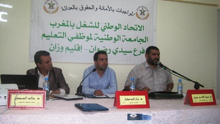 وفي المداخلة الثانية قام عضو المكتب الوطني للجامعة الوطنية لموظفي التعليم الأستاذ خالد السطي بقراءة لأهم محطات الحوار الاجتماعي مبينا في كلمته الفرق بين حوار فاتح غشت 2007 الذي كان أول اتفاق بحضور النقابات الخمسة والذي اعقبه نضال لتطبيقه بحكم أن بعض بنوده كانت تخص وزارات أخرى،اتفاق 26 أبريل 2012 حول الدرجة الجديدة والترقية بالشهادة والترقية بالتسقيف، موضحا أن الحل الأمثل للخروج من هذه المطالب الفئوية يكمن في ضرورة صياغة نظام أساسي جديد منصف ومحفز يخص قطاع التربية الوطنية بعد تجاوز إشكالية التمويل الذي تقف كعقبة في وجهه.. معتبرا العمل النقابي بالمغرب اكثر تقدما من بعض الدول العربية في تحقيق مطالب اجتماعية معتمدا مبدأ (خذ وطالب) انتزع من الحكومة واستمر في المطالب.