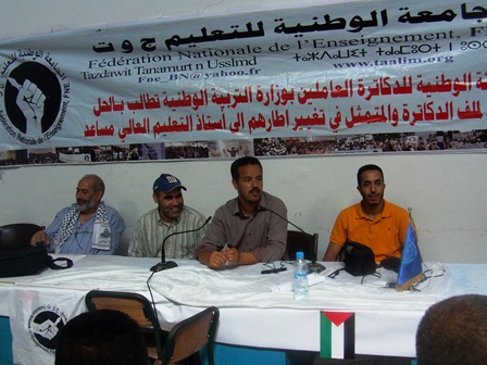 في سياق سياسة الاستهتار واللامسؤولية والحيف الذي تعاملت وتتعامل بها الجهات المسؤولة والمعنية بملف دكاترة التربية الوطنية، وبدعوة وتأطير من طرف الهيئة الوطنية للدكاترة العاملين بقطاع التربية الوطنية، والمنضوية تحت لواء الجامعة الوطنية للتعليم (ج و ت(، نظم الدكاترة العاملون بوزارة التربية الوطنية يوم الأحد 7 شتنبر 2014، جمعا عاما تواصليا للدكاترة بمقر (ج و ق ف) بحي المحيط بالرباط، حضره الكاتب العام الوطني للجامعة الوطنية للتعليم الأخ عبد الرزاق الإدريسي وبعض أعضاء المكتب الوطني، وتمحور هذا الجمع أساسا حول مناقشة الوضع الحالي للدكاترة والبرنامج النضالي الكفيل بإعادة الاعتبار لشهادة الدكتوراه بالمغرب، وسبل رفع الحيف الذي يمارس على الدكاترة.