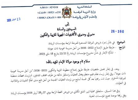 في إطار تنزيل خارطة الطريق 2022–2026 لإصلاح منظومة التربية والتكوين، أطلقت وزارة التربية الوطنية والتعليم الأولي والرياضة المرحلة الرابعة من مشروع **"المؤسسات الرائدة"**، التي تميزت بإجراء فروض المراقبة المستمرة الموحدة يومي **27 و28 أبريل 2026** عبر مختلف الأكاديميات الجهوية لل...