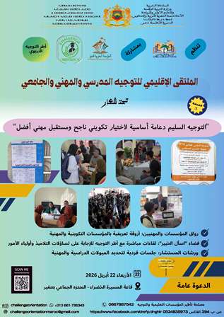 شهدت مدينة تنغير يوم الأربعاء 22 أبريل 2026 تنظيم النسخة الثالثة من الملتقى الإقليمي للتوجيه المدرسي والمهني والجامعي، الذي نظمته المديرية الإقليمية لوزارة التربية الوطنية والتعليم الأولي والرياضة بقاعة المسيرة الخضراء بالمنتزه الجماعي، تحت شعار: "التوجيه السليم دعامة أساسية لاخ...