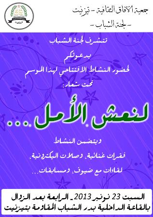 تنظم لجنة الشباب لجمعية الآفاق الثقافية بتيزنيت  نشاطها الافتتاحي للموسم الثقافي والتربوي 2013/2014 تحت  شعار:" لنعش الأمل"  لفائدة تلاميذ وتلميذات الثانوي التأهيلي والثانوي الإعدادي،   مجموعة من الفقرات الفنية والوصلات الإليكترونية وحورات مع ضيوف  تدعو الى الأمل ونبذ اليأس مع المؤطر ذ.حسان بولكروش والأستاذ البشير أصواب .وذلك يوم السبت  23 نونبر ابتداء من الساعة الرابعة مساء بإحدى القاعات الداخلية بدار الشباب المقاومة .والدعوة عامة. فكونوا في الموعد.
