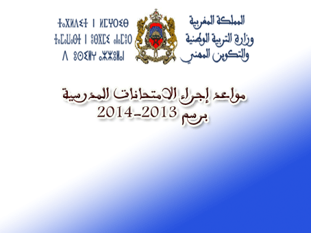 تعلن وزارة التربية الوطنية والتكوين المهني أن الامتحانات المدرسية برسم السنة الدراسية 2014-2013 ستجرى بمختلف مكوناتها وفي جميع الأسلاك التعليمية وفق المواعد التالية :